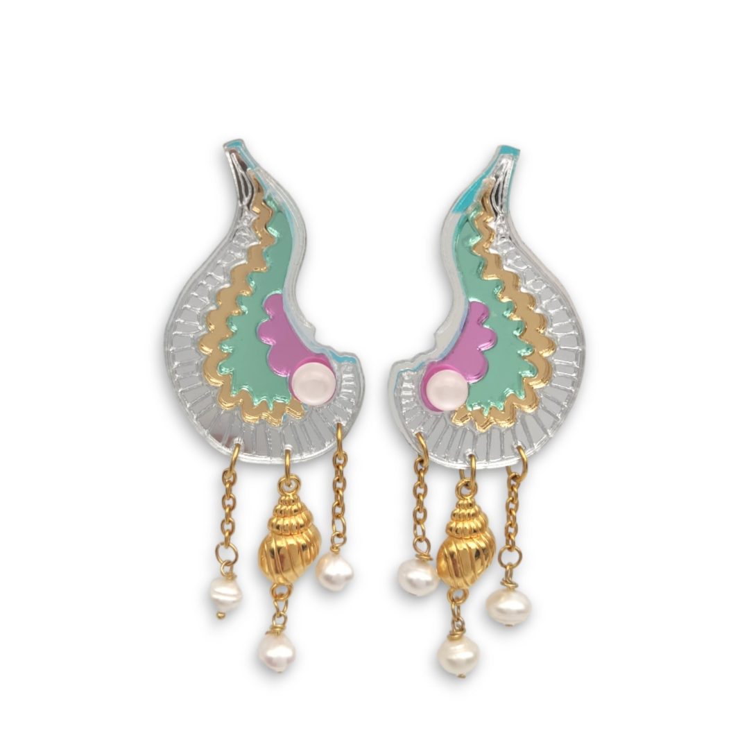Ένα κόσμημα που μοιάζει να ταξίδεψε από τον βυθό. Το Atlantic είναι ένα μοναδικό, χειροποίητο σκουλαρίκι από plexiglass, εμπνευσμένο από το σχήμα του κύματος και το μυστήριο της θάλασσας. Με λεπτομέρειες σε pastel αποχρώσεις, πολυτελή πέρλα και αιωρούμενη χρυσή αλυσίδα, μεταμορφώνεται σε κινητό έργο τέχνης κάθε φορά που κουνιέται. Ένα funky κομμάτι με δραματική κομψότητα.