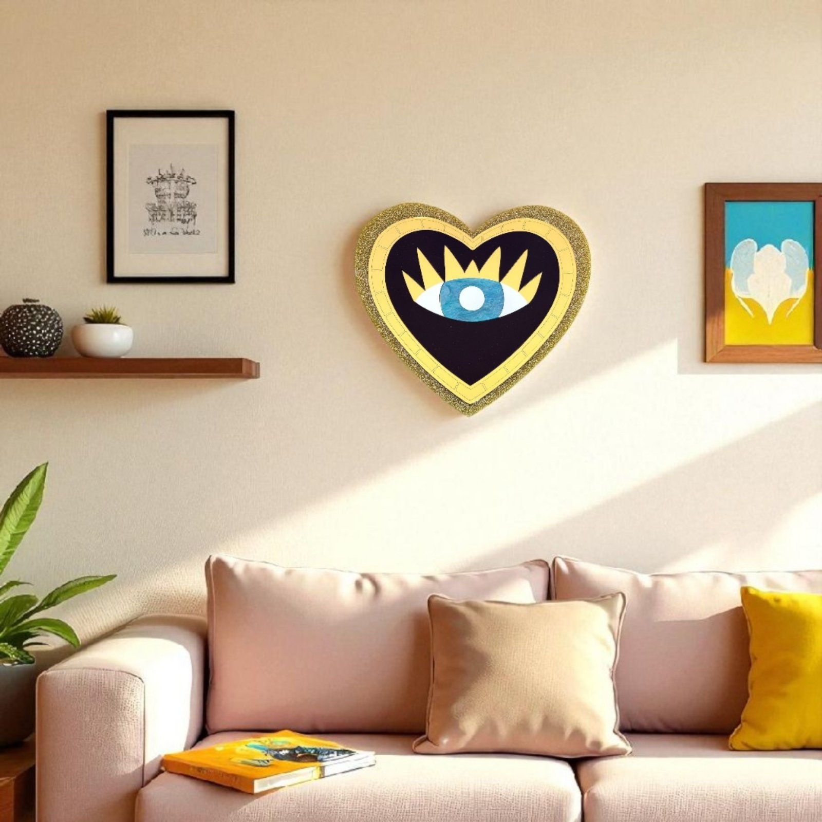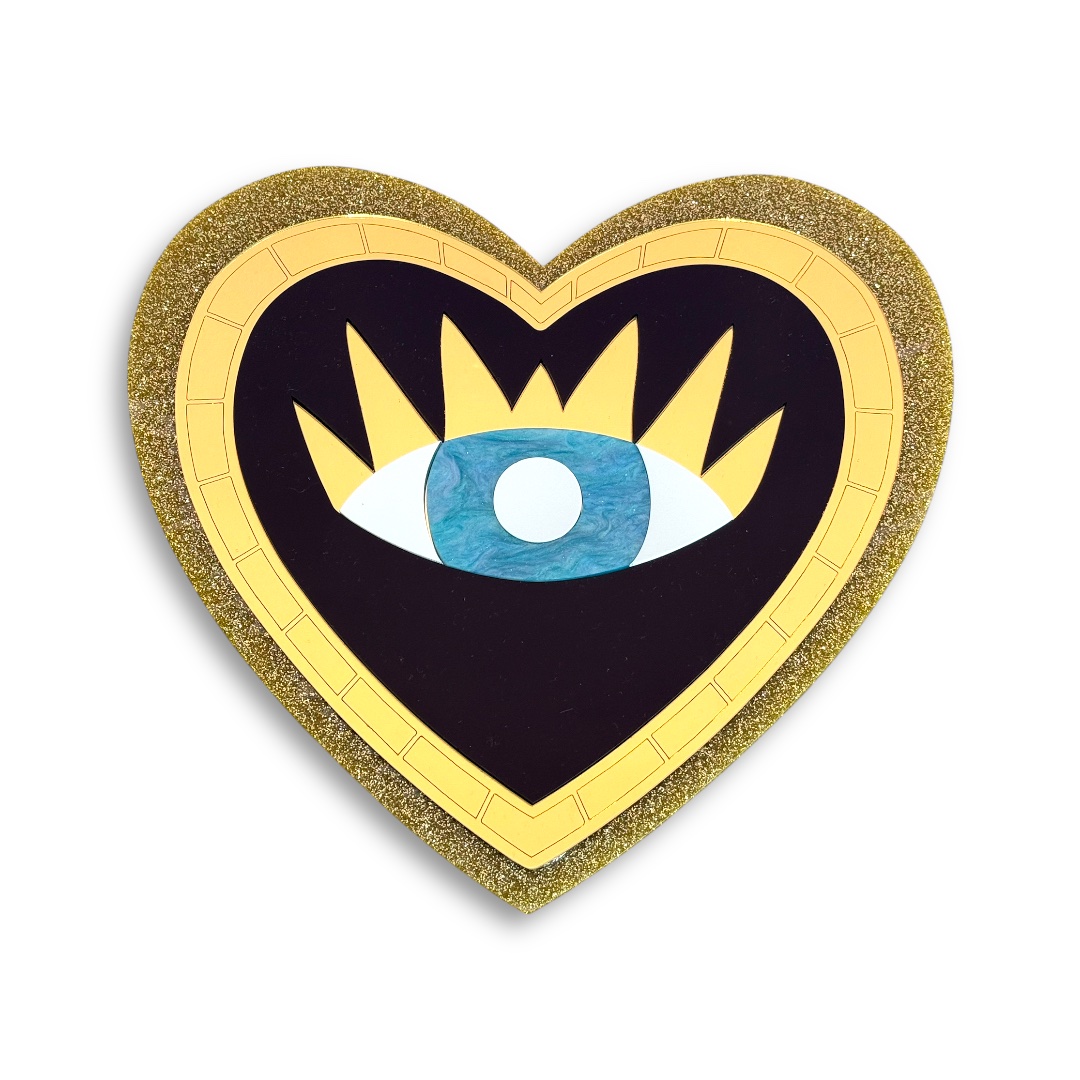 Το Enigma Wall Art είναι ένα χειροποίητο επιτοίχιο διακοσμητικό από plexiglass σε σχήμα καρδιάς, με έντονο μπλε μάτι στο κέντρο και χρυσές λεπτομέρειες. Ένα mystic art piece που συνδυάζει προστασία και αγάπη, αποπνέοντας ταυτόχρονα ένταση και μυστήριο. Το glitter περίγραμμα δίνει extra λάμψη και funky pop αισθητική, κάνοντάς το μοναδικό κομμάτι διακόσμησης.