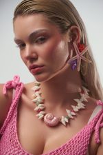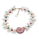 Ένα κολιέ εμπνευσμένο από τη φυσική ομορφιά των νησιών και τη μαγεία του ελληνικού καλοκαιριού. Το Nerida Necklace είναι ένα χειροποίητο, καλοκαιρινό κόσμημα με φυσικά κοχύλια, επιχρυσωμένα κεραμικά στοιχεία και ημιπολύτιμους λίθους αχάτη σε ζωηρές αποχρώσεις. Το ροζ κοχύλι στο κέντρο λειτουργεί σαν φυλαχτό – ένα παιχνιδιάρικο, συμβολικό στοιχείο που τραβά το βλέμμα.