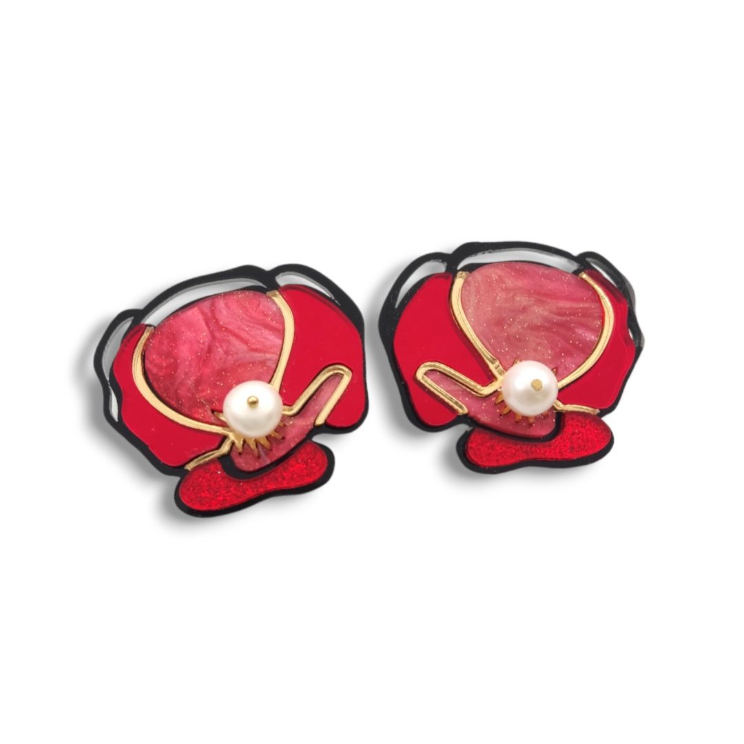 Ένα κόσμημα-φόρος τιμής στην ομορφιά της παπαρούνας. Τα Poppy είναι χειροποίητα σκουλαρίκια από plexiglass, εμπνευσμένα από τη φόρμα και την ένταση του πιο εύθραυστου και εκφραστικού λουλουδιού της φύσης. Ο κόκκινος όγκος, οι οργανικές γραμμές, η χρυσή πινελιά και η μαργαριταρένια καρδιά, δημιουργούν ένα αξεσουάρ που ισορροπεί ανάμεσα στην τέχνη και τη μόδα.