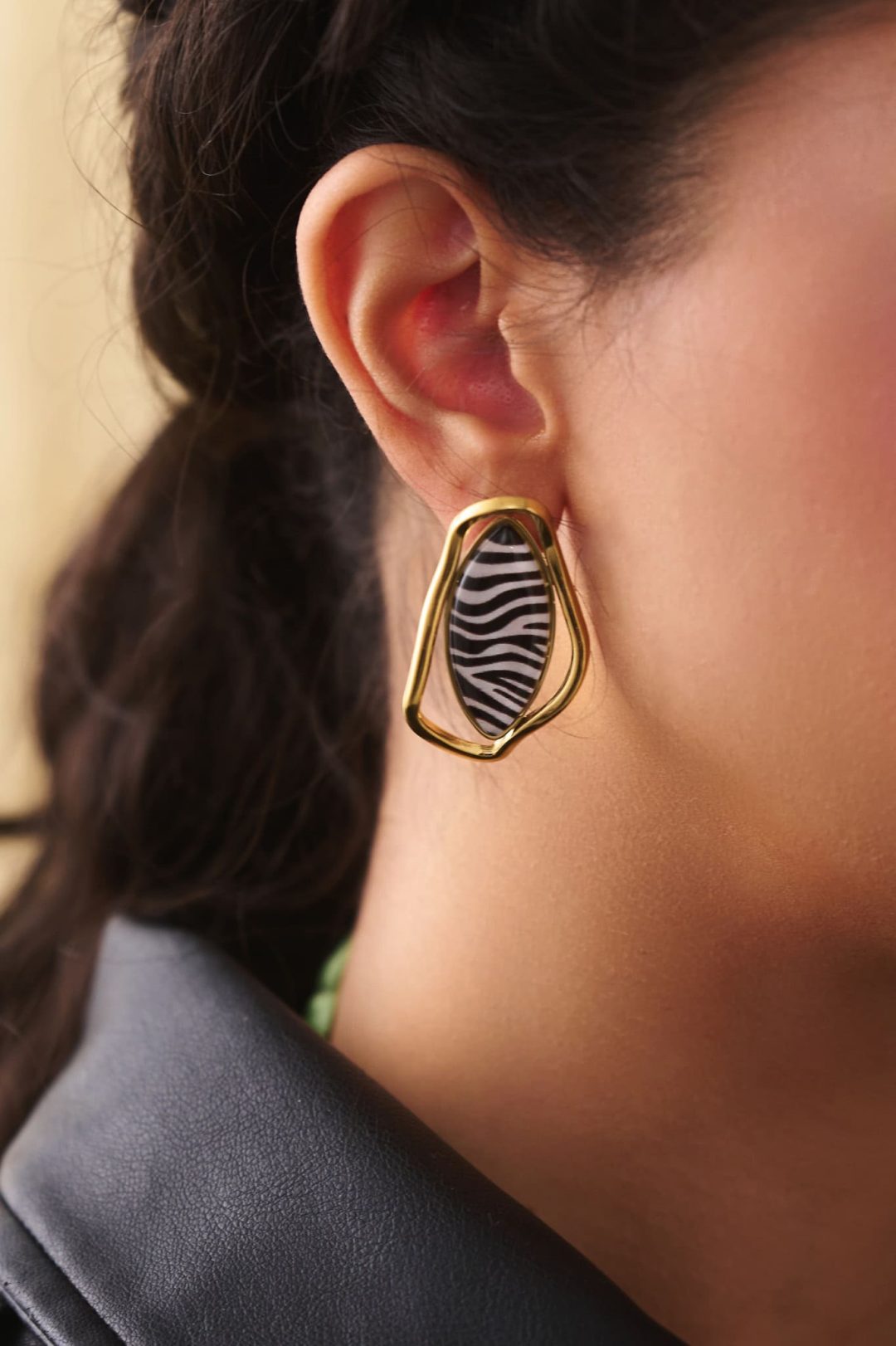 Αναδείξτε την άγρια και μοντέρνα πλευρά σας με τα Savanna Earrings! Με έναν εντυπωσιακό σχεδιασμό που συνδυάζει το κλασικό zebra print με ένα κομψό χρυσό περίγραμμα, αυτά τα σκουλαρίκια είναι η απόλυτη δήλωση στυλ. Το γεωμετρικό τους σχήμα και η ζωηρή αντίθεση των χρωμάτων τα καθιστούν ιδανικά για να ξεχωρίσετε.