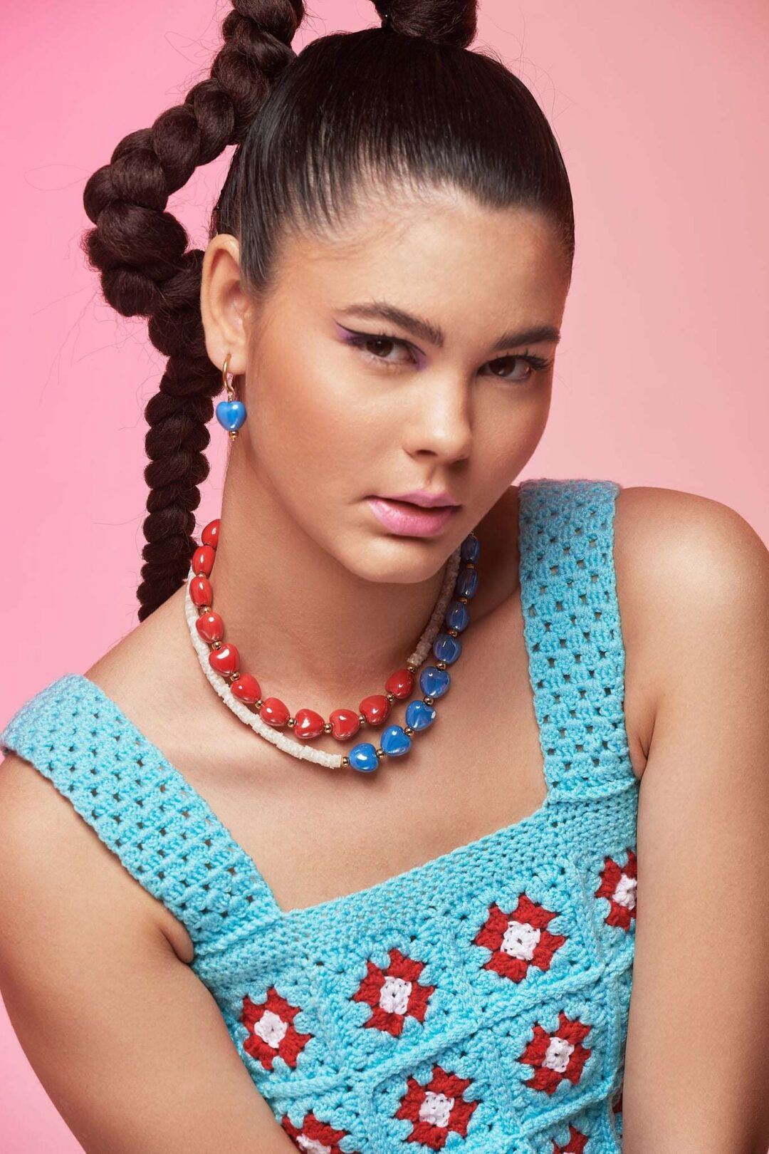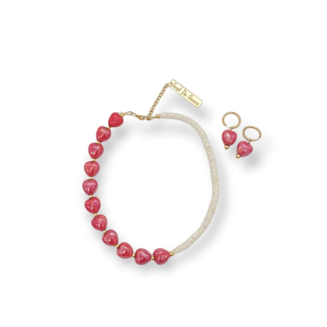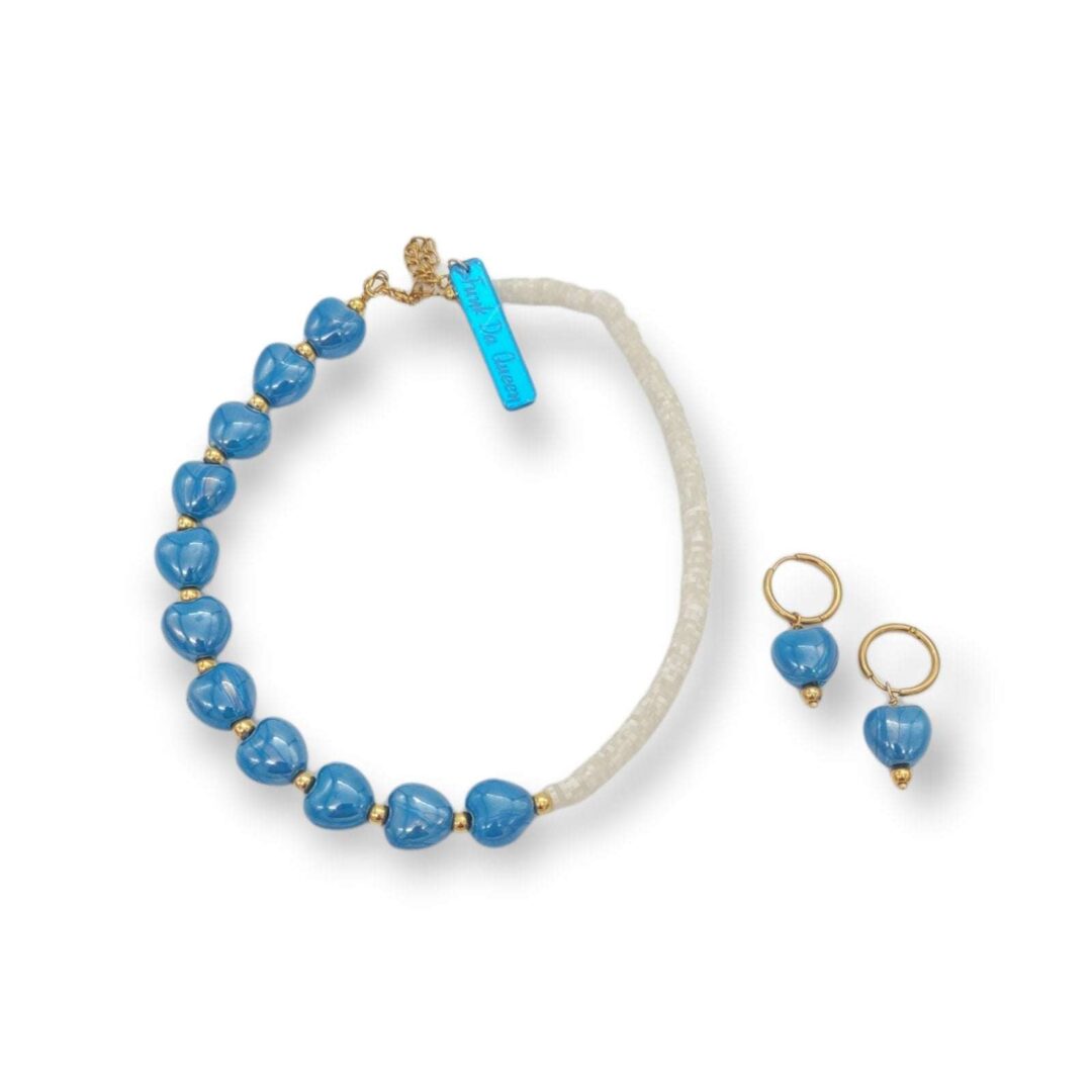 A set of necklace and earrings. Everyone dreams of finding their soulmate. It’s a universal quest. All over the world millions of people are looking for their true love, their amore thier ame soeur, that one special person with whom they will spend the rest of their life. A necklace which consists of ceramic and heishi beads, and gold platted parts too. Available in two colors: red and blue.