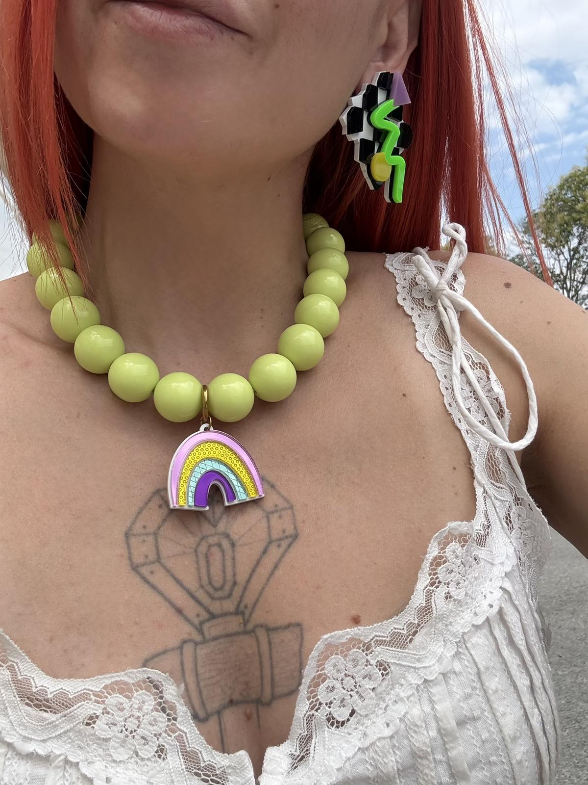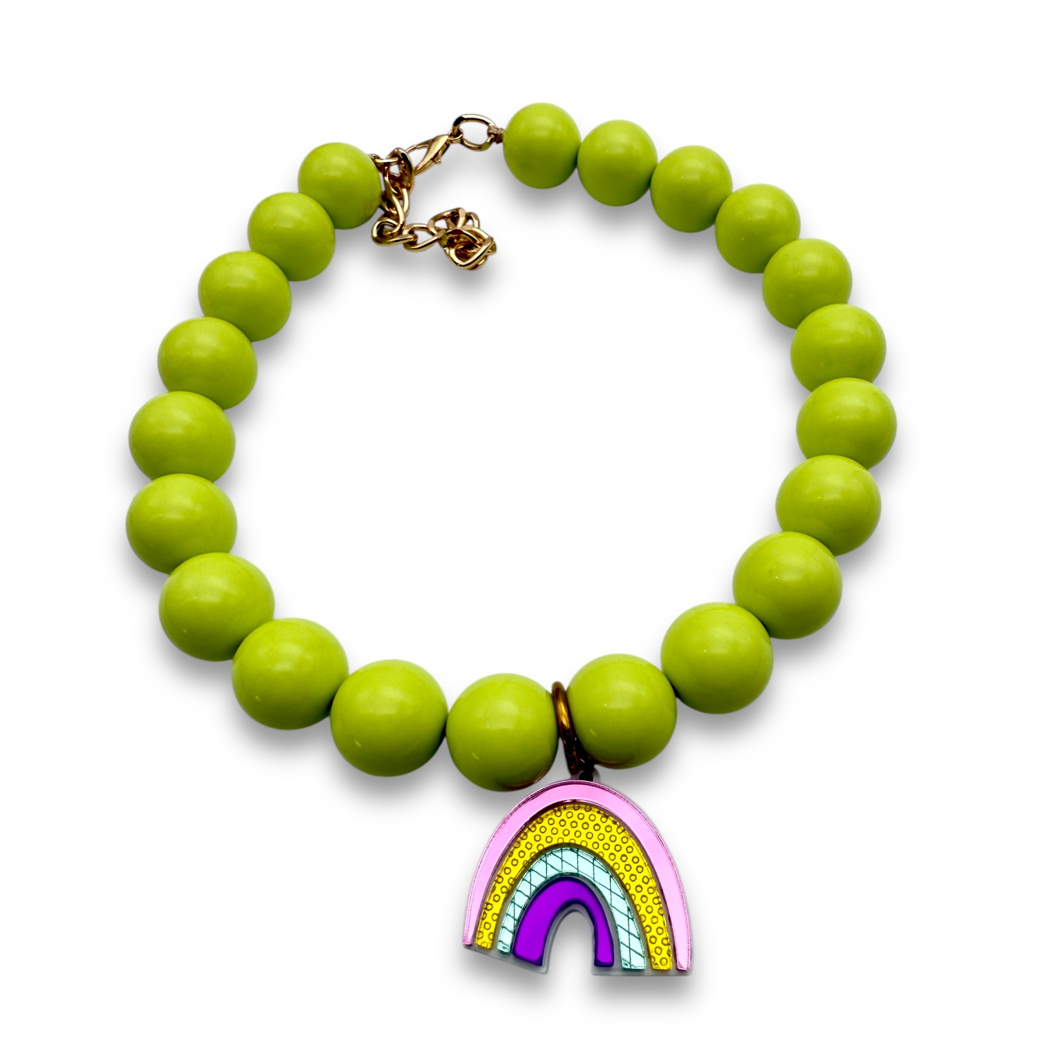 The Beadline Rainbow necklace is all about color and optimism. Fresh lime green beads meet a playful plexiglass rainbow charm, creating a handmade piece full of happy vibes that brightens up your everyday style.