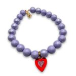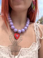 The Beadline necklace stands out with its lilac beads, creating a soft yet striking contrast with the bold red plexiglass heart at the center. A playful handmade piece that adds both color and personality to any look.