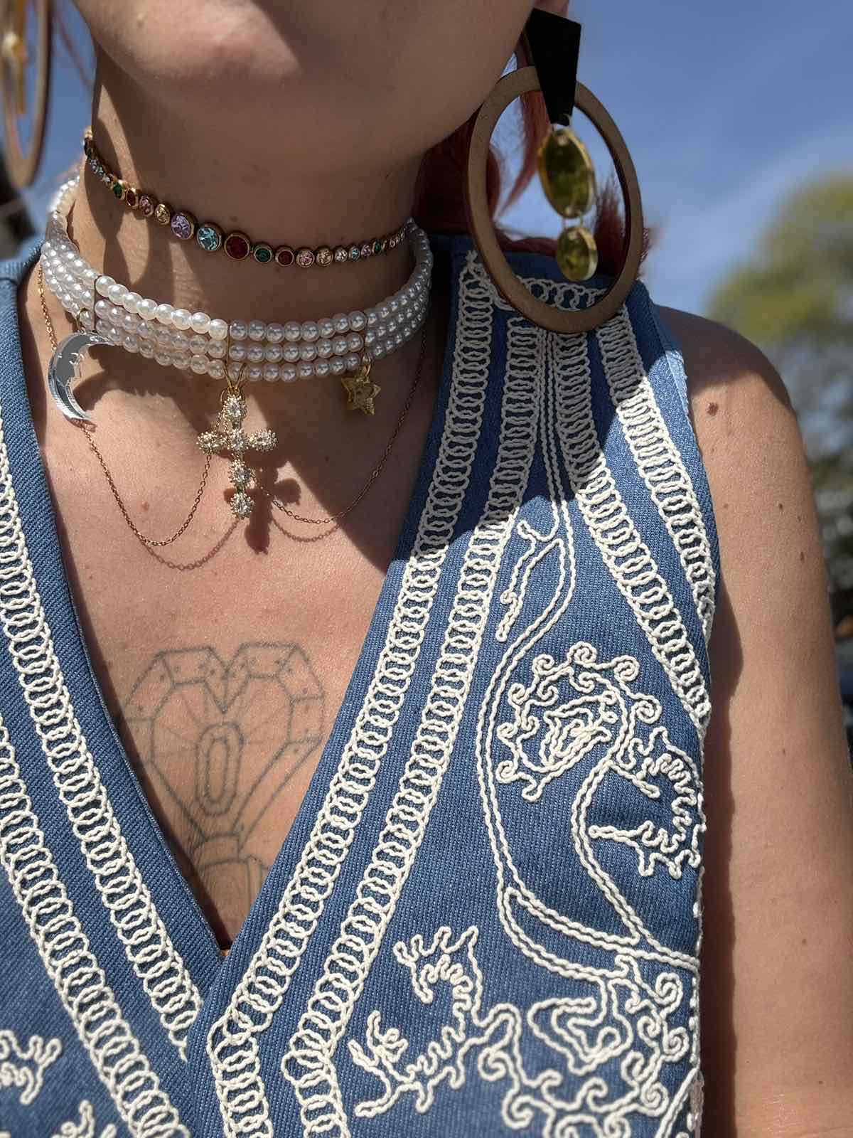 The Celestial Faith Choker is a striking statement piece featuring triple rows of white pearls that elegantly embrace the neck. At the center, a dazzling zircon cross stands out, while the plexiglass moon and star charms add a celestial and playful touch. A necklace that blends timeless elegance with a modern edge.