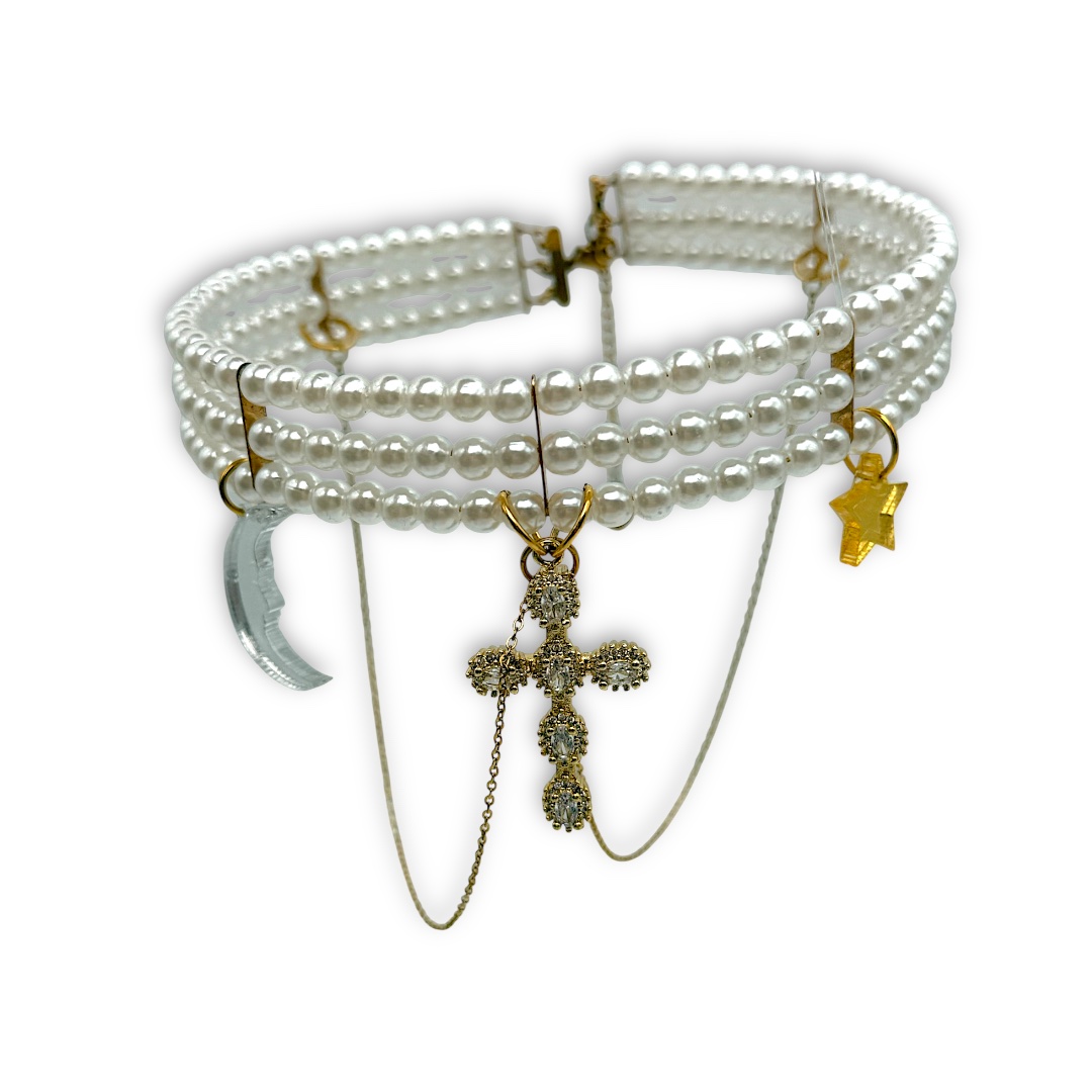 Celestial Faith Choker – Pearl Necklace with Cross & Plexiglass Charms