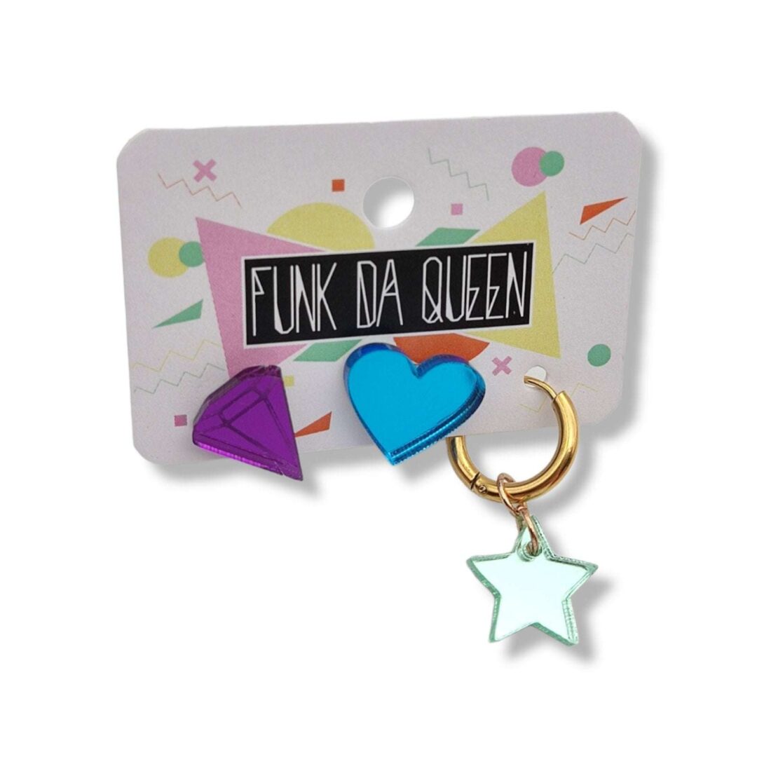 Triple on fire! Funk da Queen gives you the option to purchase three designs, by giving you the chance to wear a different combination everyday. Diamond, heart and star in golden hoop. Enrich your everyday casual style!