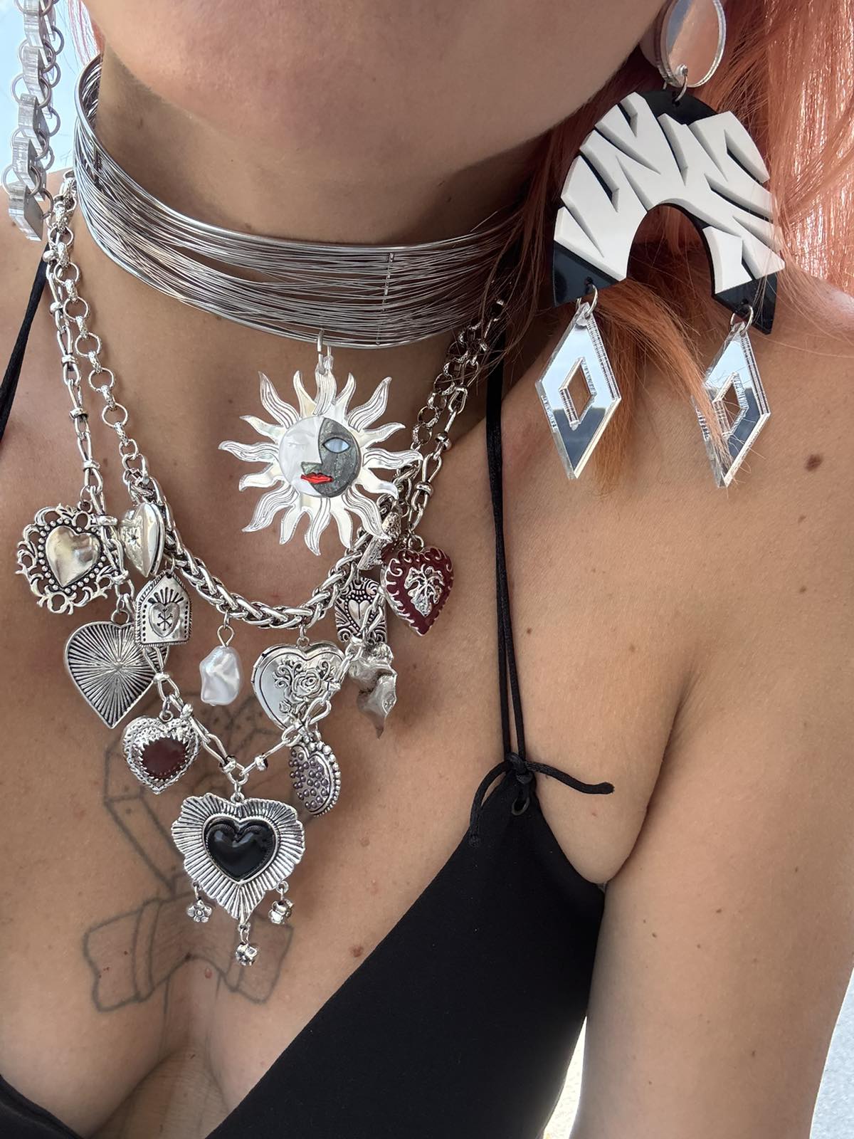 The Double Trouble necklace brings double the style and emotion. Two layered chains filled with unique heart charms create a bold statement look. Its standout feature: a brass heart locket that opens to hold a photo or personal keepsake.