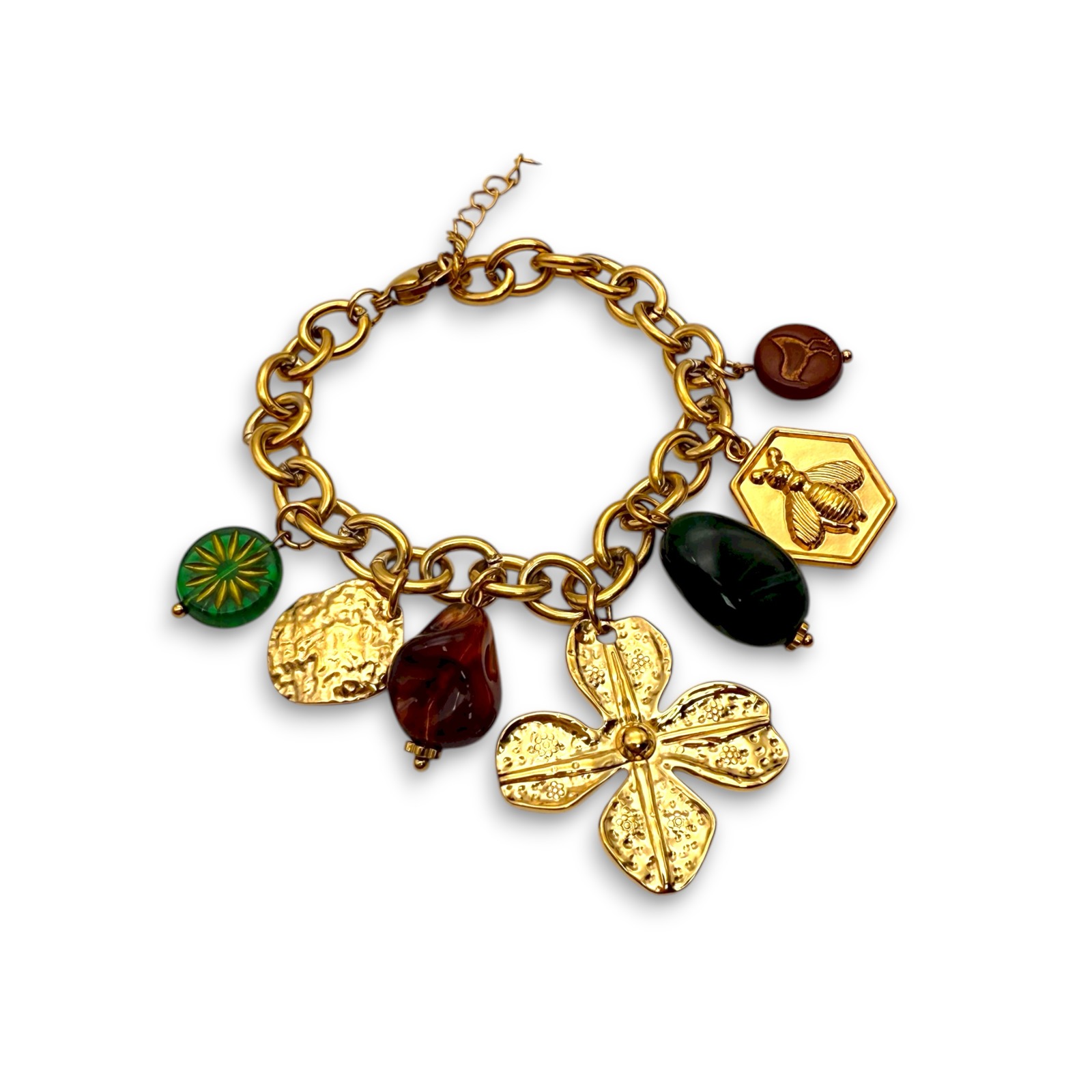 The Golden Eden Bracelet is a stainless-steel chain bracelet featuring golden charms and nature-inspired details – a bee, a flower, and colorful glass beads in green, amber, and earthy tones. A piece that captures the glow of sunlight, vintage charm, and the spirit of a mythical garden.