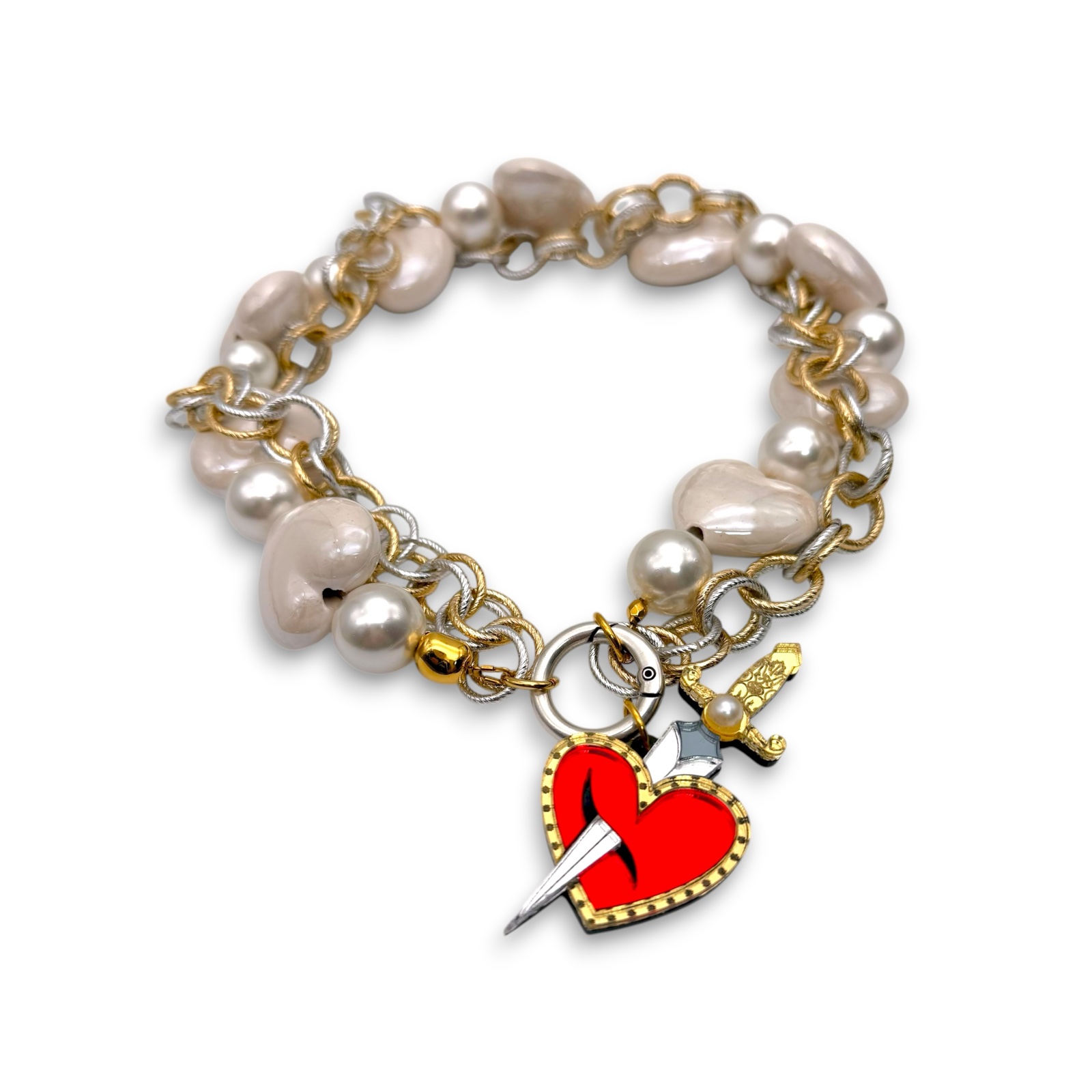 Heartstab Necklace – Handmade Necklace with Pearls, Ceramic Heart and Two-Tone Steel Chain