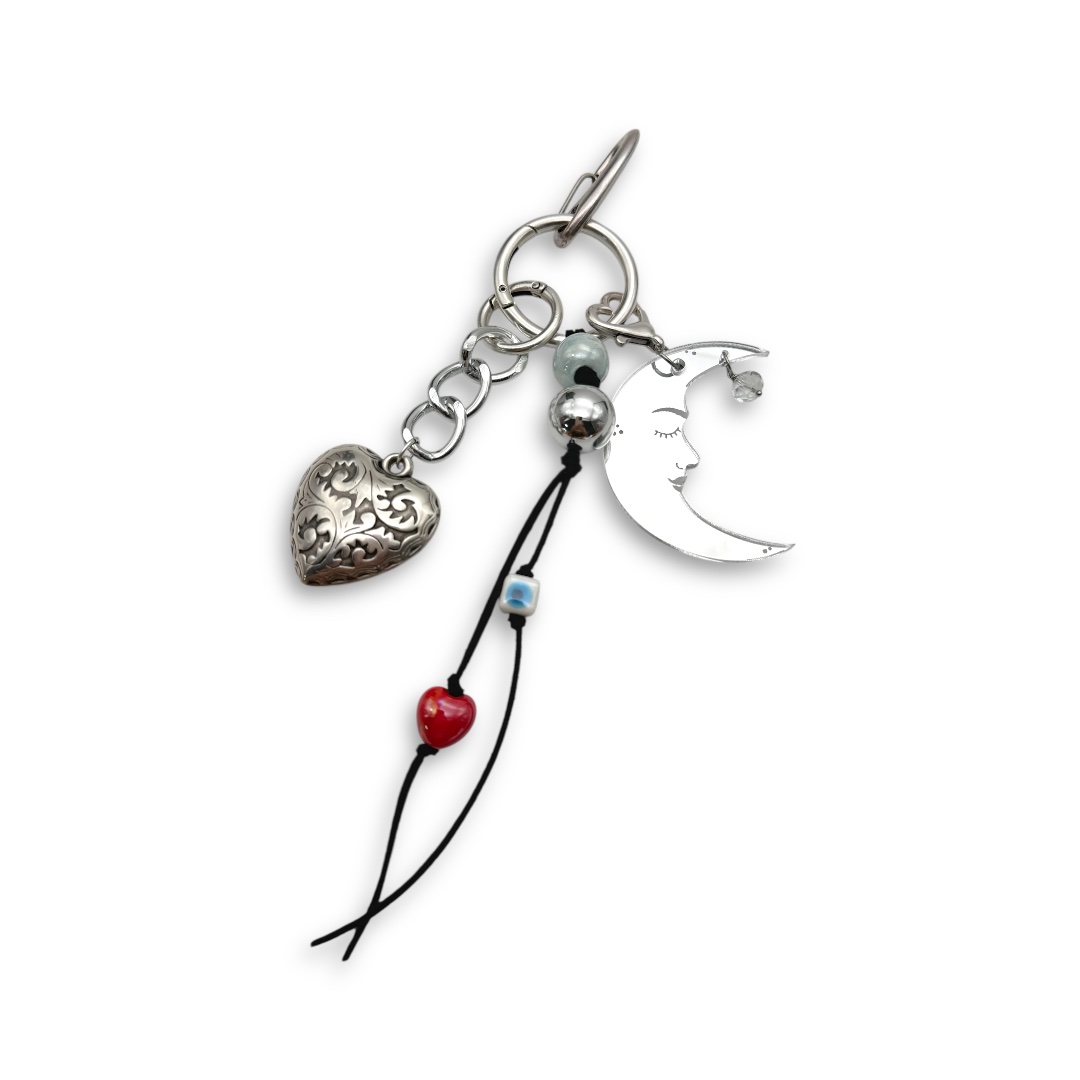 Upgrade your style with this fashion-forward keychain. Featuring a plexiglass mirror moon, a plastic heart, and ceramic beads, it’s a statement accessory that stands out. Perfect to attach on your bag, keys, or even the belt loop of your jeans. A must-have detail for trendsetters who love unique fashion touches.
