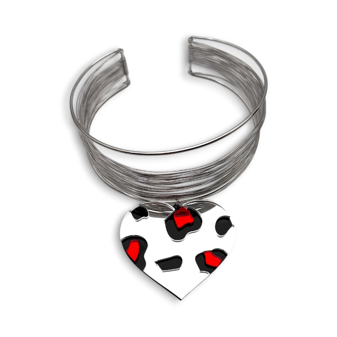 The Leoheart Choker is a bold statement necklace that blends the wild charm of animal print with the unique shine of plexiglass. The heart-shaped pendant hangs from a multi-wire metallic choker, creating an eye-catching piece that adds attitude and character to any outfit. Perfect for those who love to stand out.