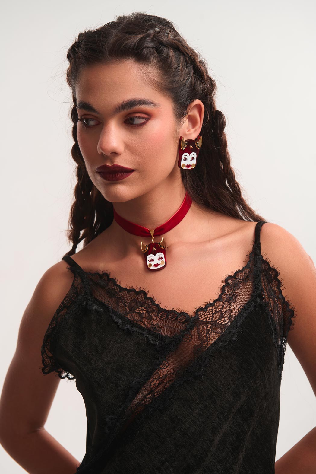 The Lil Devil Choker is a handmade velvet necklace featuring a plexiglass pendant inspired by the playful spirit of the little devil. Deep red tones blend with golden details and sparkling zircon eyes, balancing passion and mystery. The soft velvet ribbon gracefully wraps around the neck, while the bold motif brings a fierce, confident character to every look.