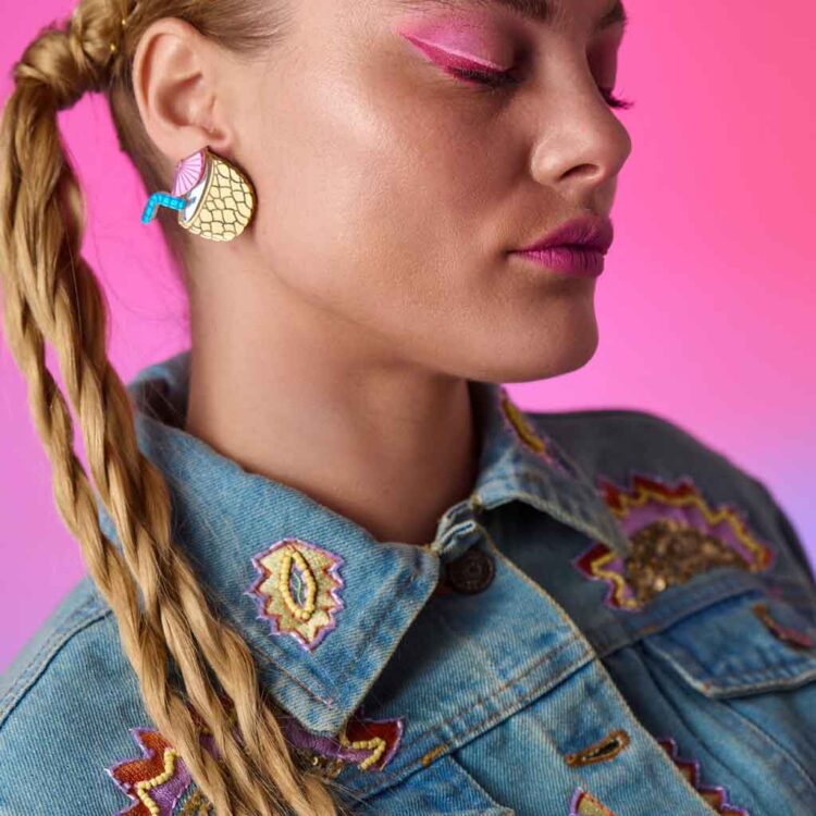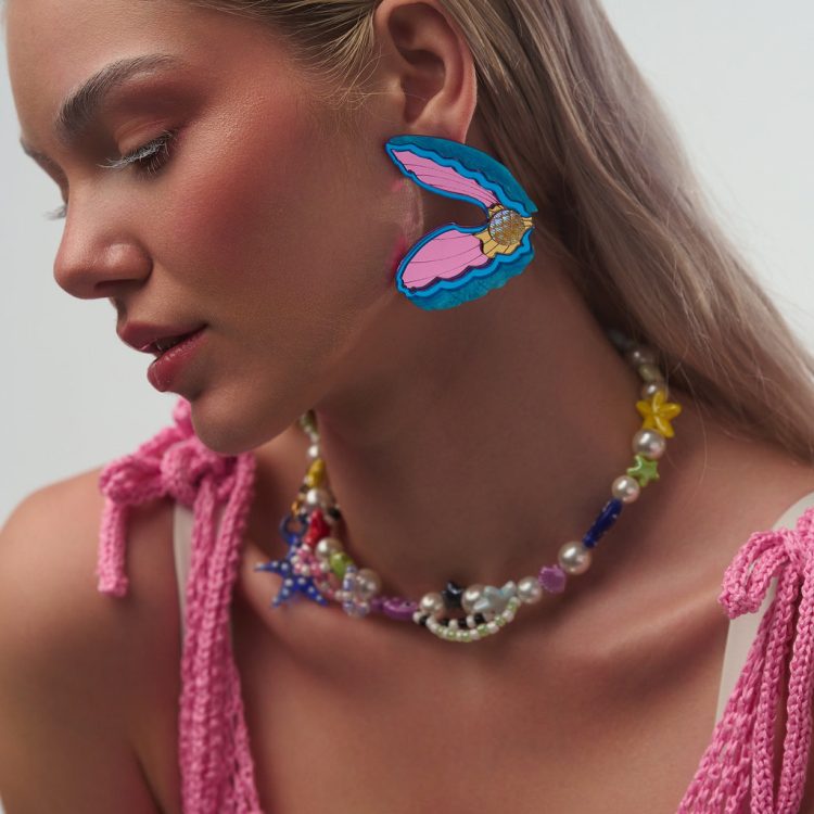 The Lobster Queen earrings are handmade statement pieces crafted from plexiglass, featuring a bold red lobster, shimmering glitter, an orange seashell detail, and a freshwater pearl. A vibrant accessory for those who love playful designs with a glam twist.