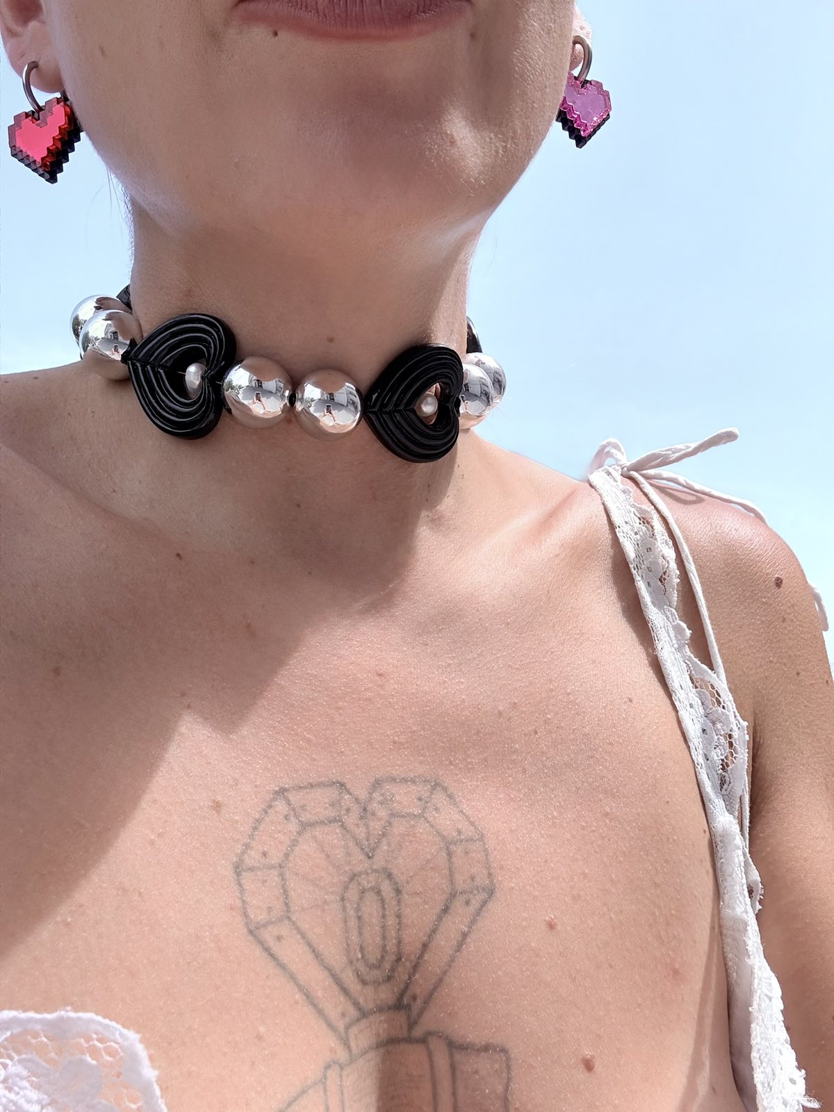 The Midnight Choker is a true all-season statement piece. Black resin hearts with pearls at their center meet shiny silver plastic beads, while stainless steel and gold-plated details add durability and elegance. Perfect for any occasion: wear it with an evening dress or layer it over a hoodie or knitwear for a fashion-forward look.