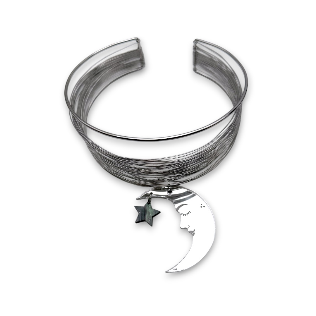 The Mystic Moon plexiglass choker necklace with crescent moon and star is a handmade piece that blends mystery with modern style. Crafted from lightweight plexiglass, it feels comfortable all day while adding a bold touch. The crescent moon and star give your look a celestial vibe that always stands out.