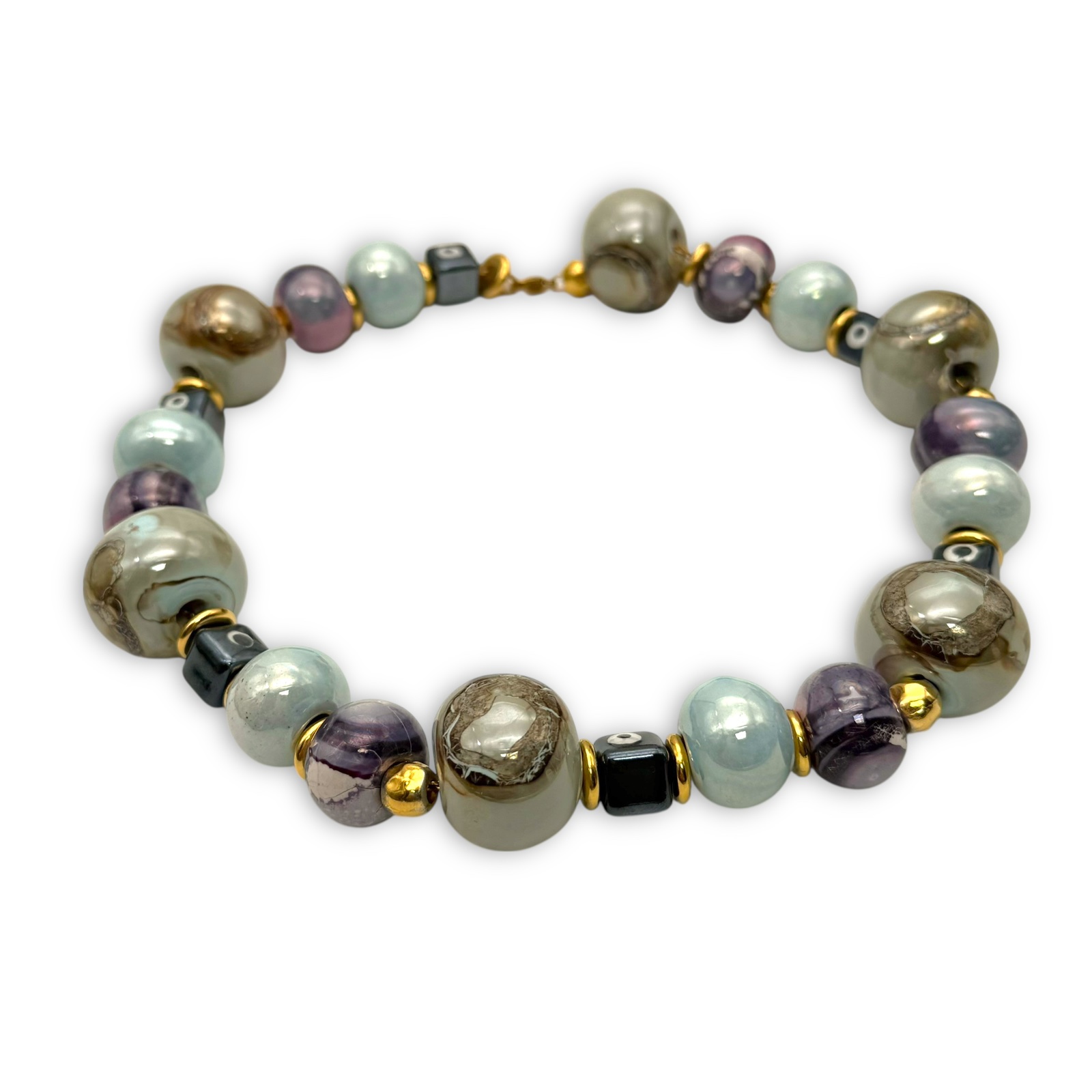The Orbit Necklace captures the rhythm of light in motion through handcrafted ceramic beads with a natural gloss and gold-plated details. Shades of grey, lilac, and aqua flow harmoniously, while stainless steel adds a subtle touch of strength and durability.