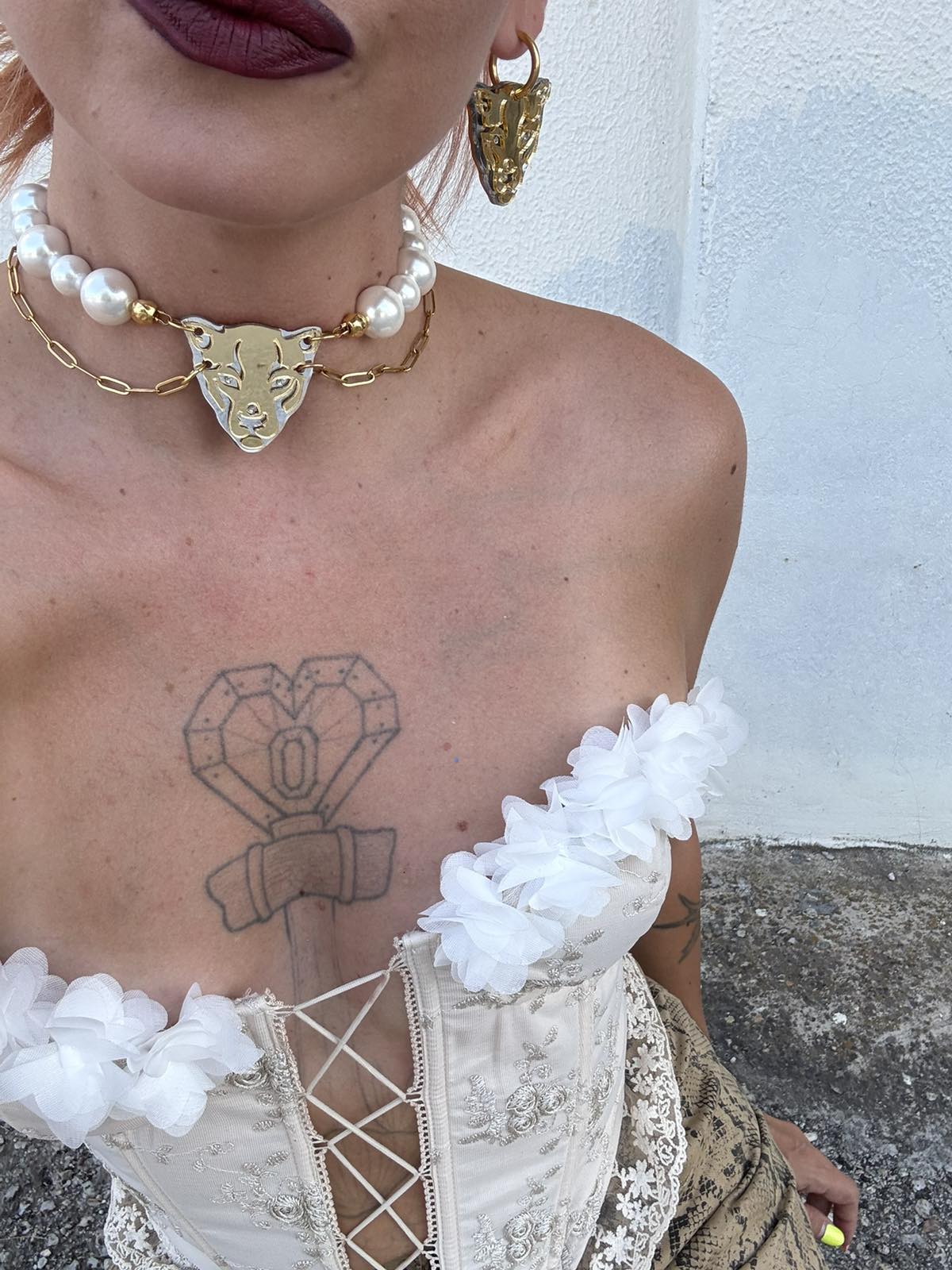 The Panther Power Choker is a bold statement piece combining strength and elegance. A gold and silver plexiglass panther centerpiece is paired with mother-of-pearl beads and a gold chain, creating a necklace full of power and style.