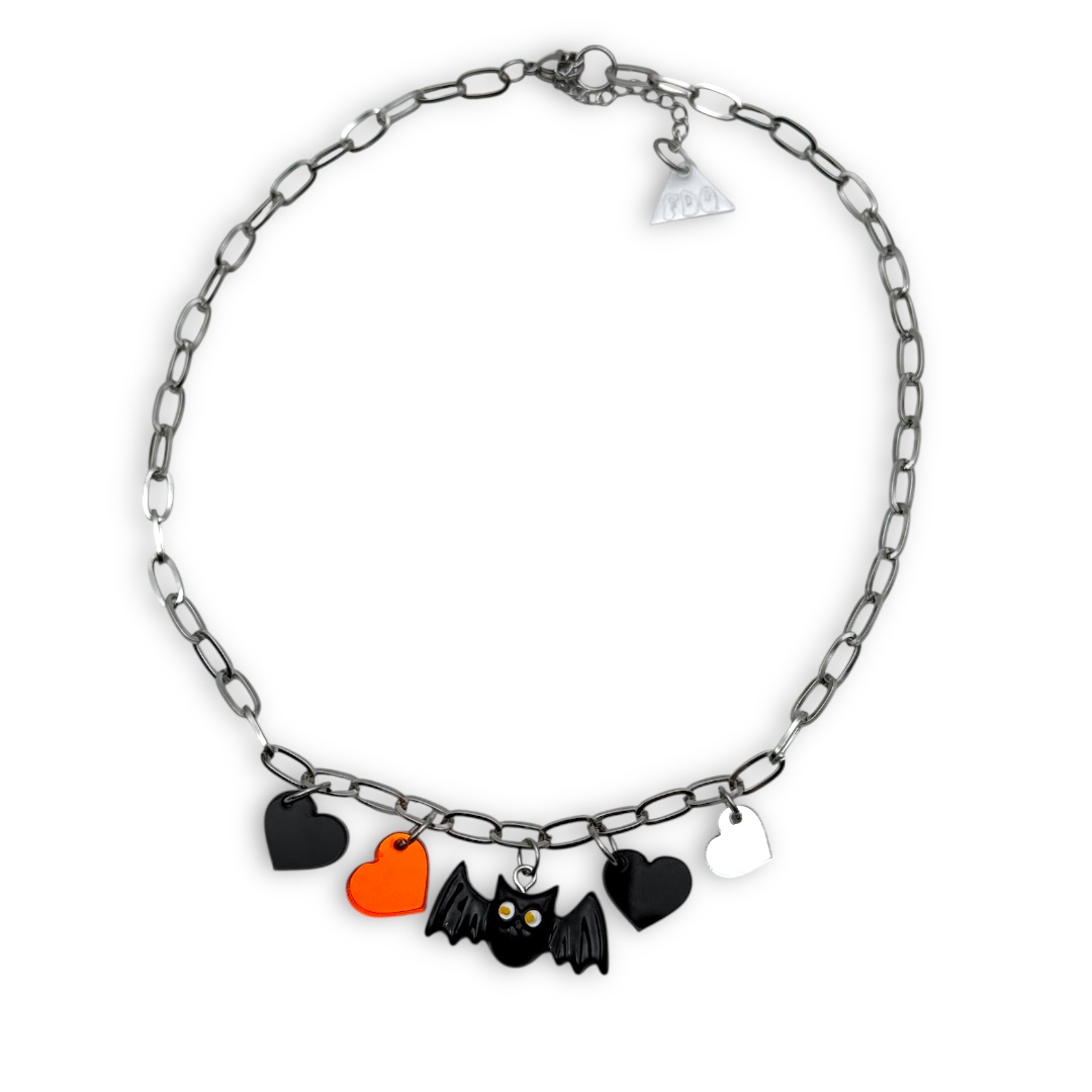 The Spooky Bat Necklace is the ultimate Halloween accessory that will take your outfit to the next level. Featuring a playful resin bat with plexiglass hearts in black, white, and orange, it’s paired with a durable stainless steel chain for extra style and strength. A statement piece that balances between cute and spooky, perfect for adding a dark-glam twist to any look.