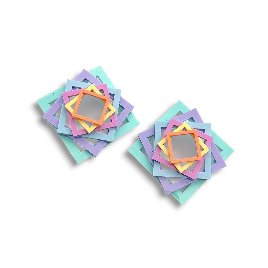 A burst of color and geometry. Twister is a bold spiral of stacked plexiglass shapes in vibrant hues — a wearable piece of pop art that instantly grabs attention. Lightweight, dynamic, and made for those who live out loud.